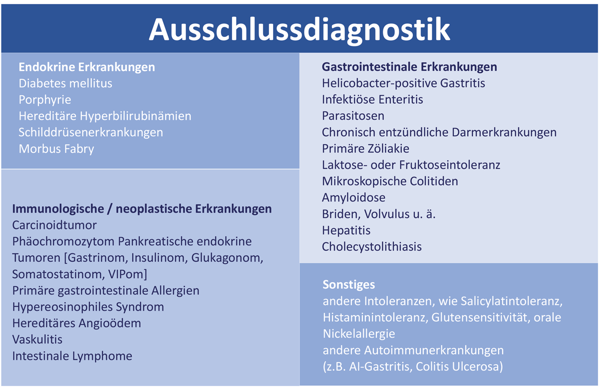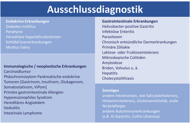 Eine Übersicht von Erkrankungen, die verschiedene Symptome verursachen können, die auch bei einem Mastzellmediatorsyndrom auftreten und die daher entsprechend berücksichtigt werden müssen (in Klammern Strategien zum Auschluss der Erkrankung).